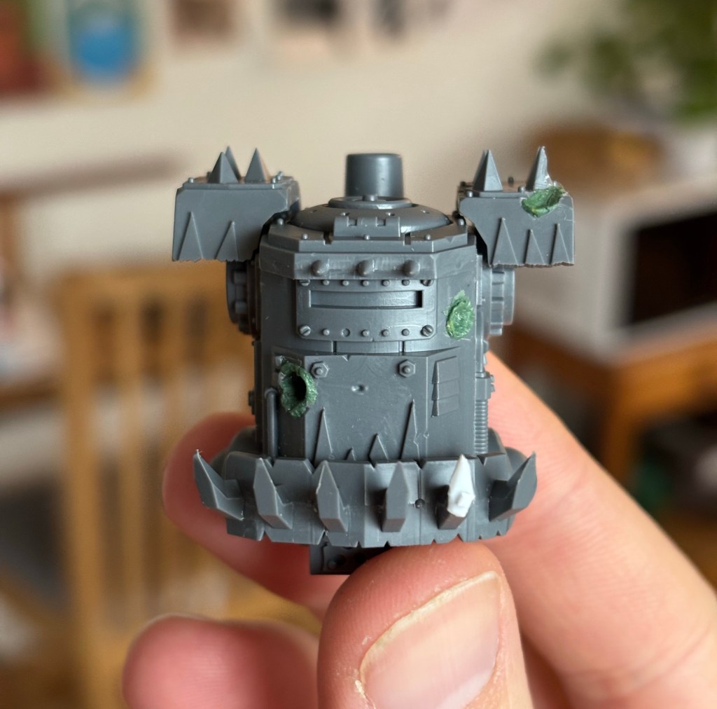 Yep, there’s a hole in Piston’s face. My headcanon for this is that Piston recently changed owners. It turns out spray foam can’t stop a 70mm anti tank shell and the grot pilot got turned into minced tofu. I had a fun time making the shell craters, especially the ricochet off the left pouldron.