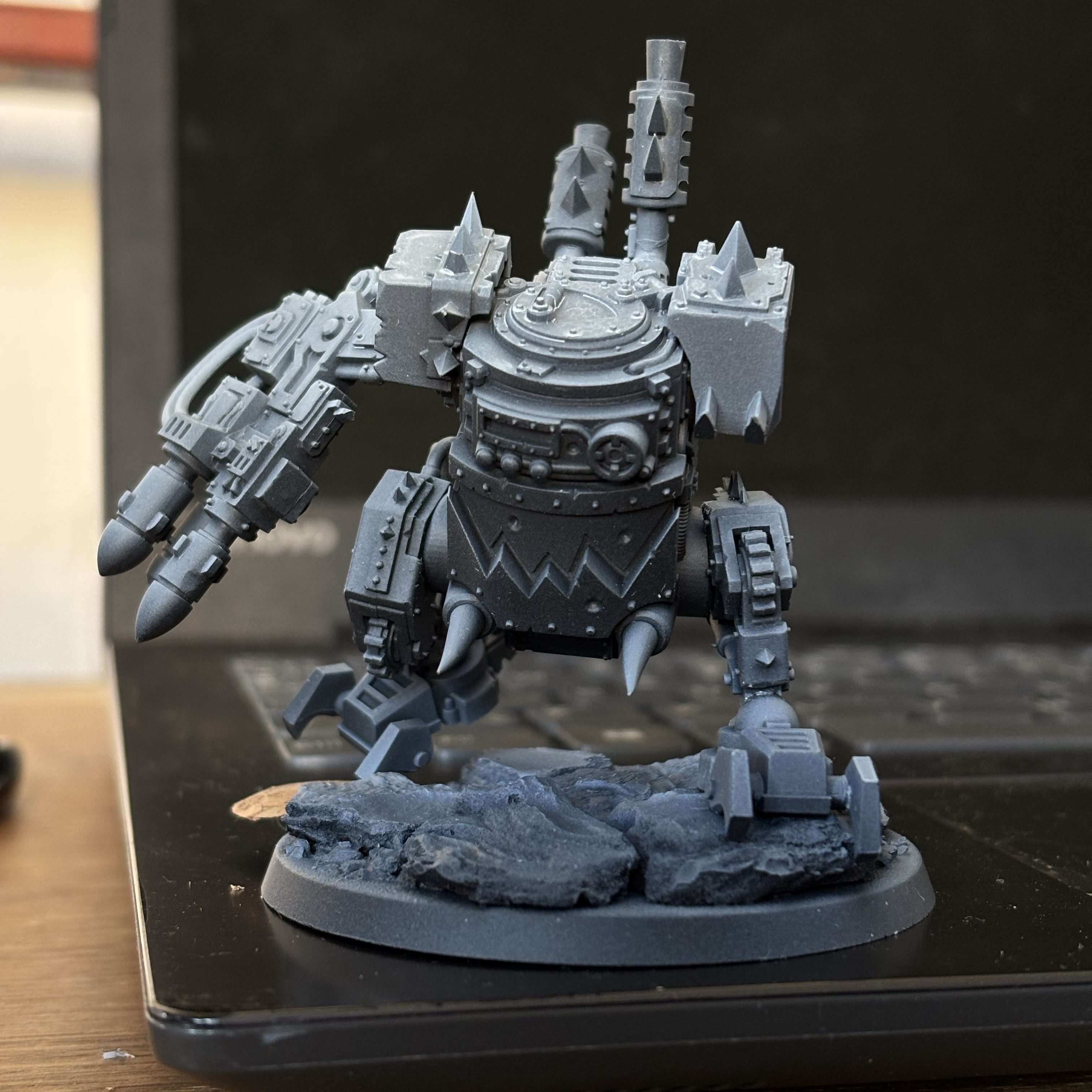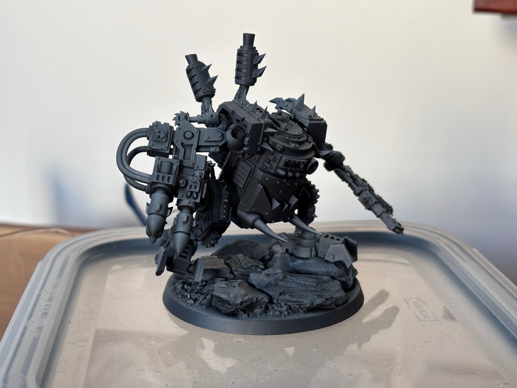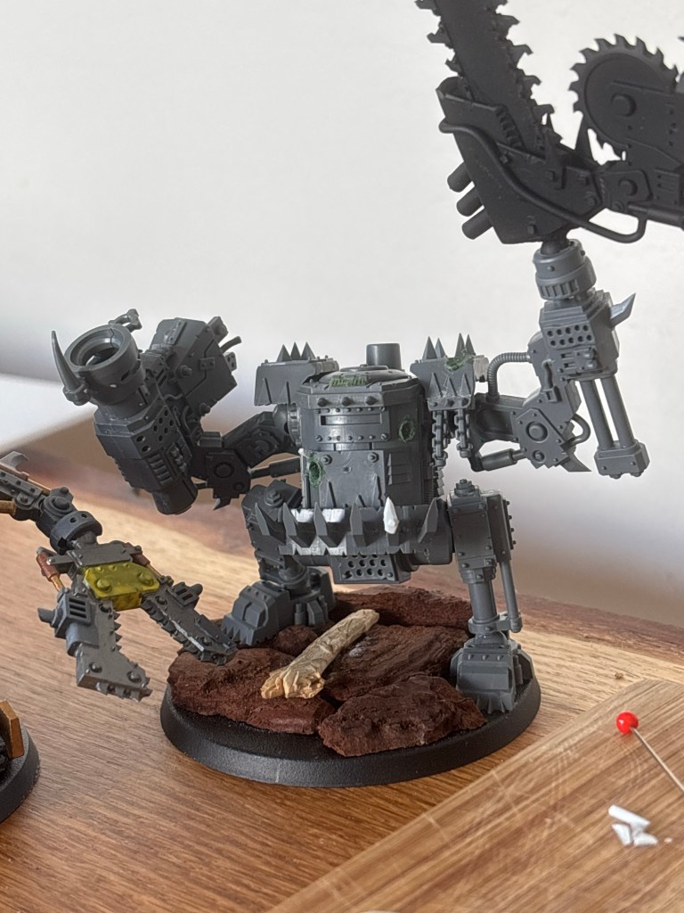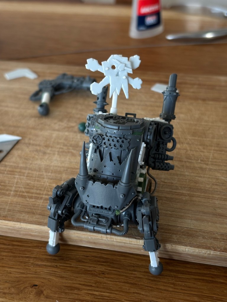 I wanted a deff dread, but it turns out that they’re for online sales only, so my local game store doesn’t stock them. Buying one of those outside the large combat patrol box is also slightly more expensive than the kit of three killa kanz… I decided to instead make a dread out of one of my kanz.