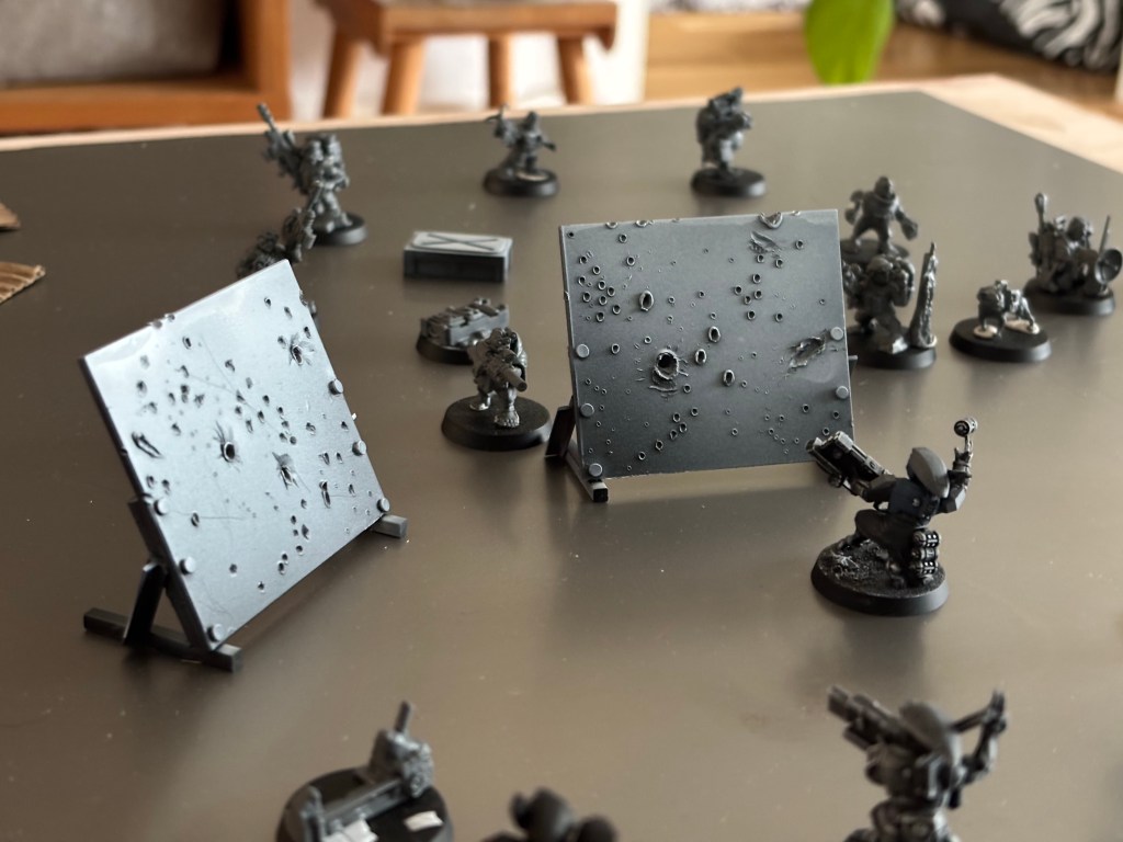 Some 2mm ABS plasticard slabs littered with potmarks and craters from impacted rounds and cannon shells. I started making craters with the tip of a box cutter before finding my soldering iron and going ham.