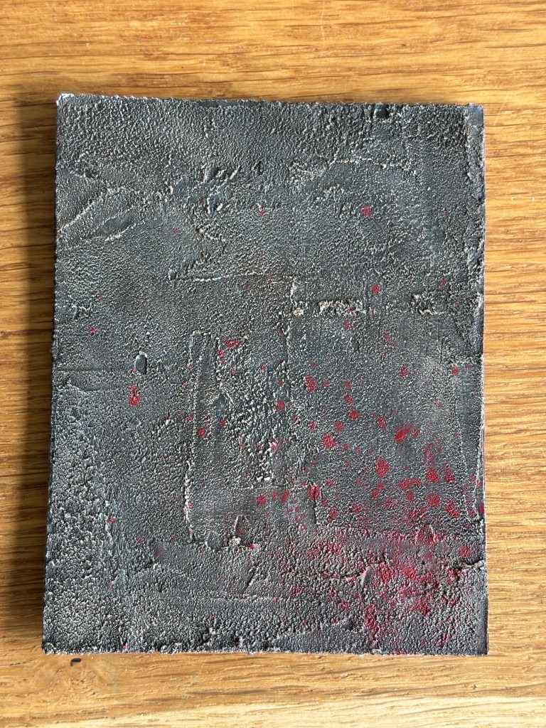 I sealed the cardboard with three layers of diluted wood glue before adding the plaster and that seems to have held crinkling to a minimum. The plaster does however shrink when drying so I’ll make sure to brace the slabs next time around, as my test sample curled quite significantly.