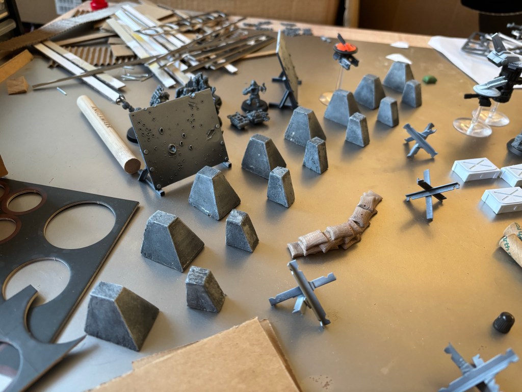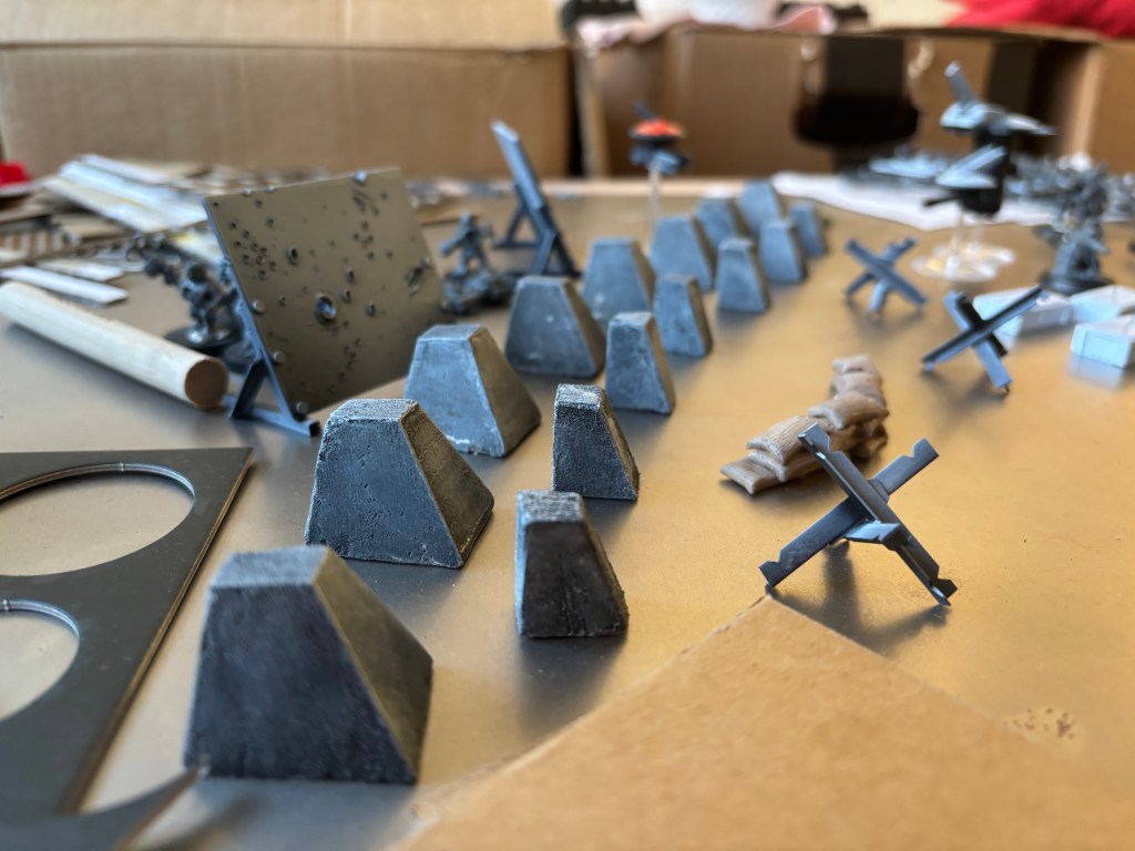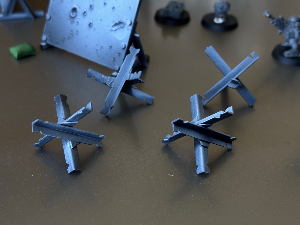 Speaking of tanks, here are some Czech hedgehogs I threw together from plasticard, T and L profiles to be specific. Cheap and easy to make, I can see why these things are so common in real warzones. It doesn’t matter if they were to get tipped over by an explosion either, they’re just as effective in any orientation.