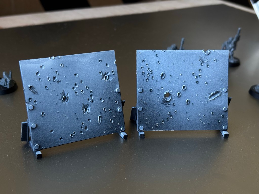 The best approach seems to be a combination, carving a hole with the tip of the knife and then coming in at the desired angle with the tip of the soldering iron and applying light pressure. I went a bit too crazy before I figured this out, resulting in one of the plates looking considerably more uniform and melted than the other. I’m not a big fan, but I suppose I’ll paint that one up to represent plasma craters instead of bullet holes.