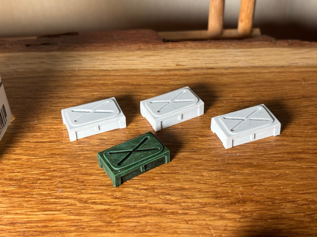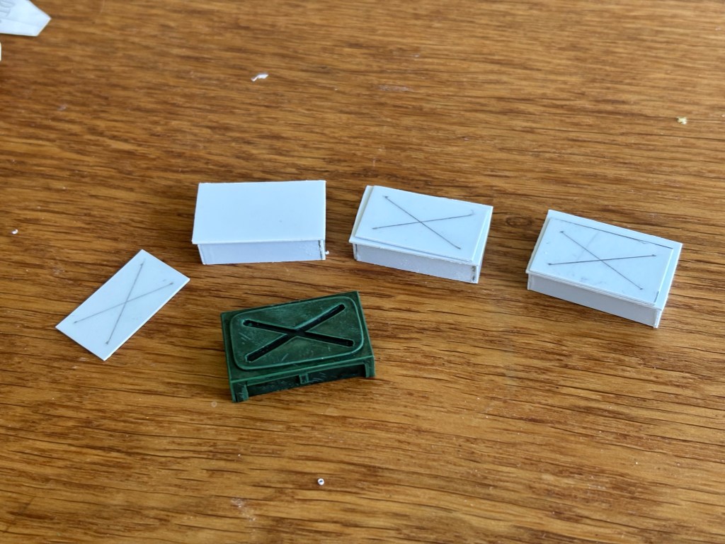 Here are a few in-progress crates, I glued these together with Tamiya ABS plastic cement.