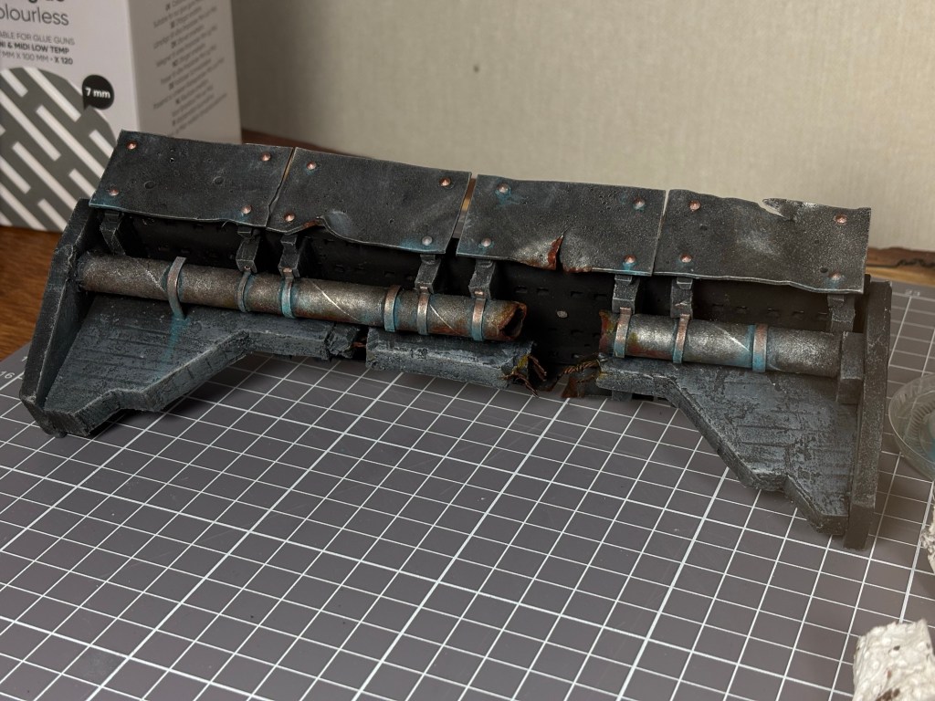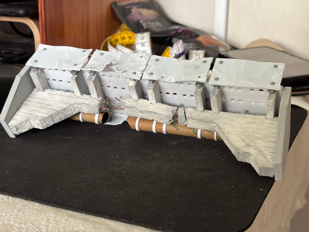 I ripped and buckled two of the railing pieces, ”smashed” the concrete leaving it hanging on by the exposed rebar and burst a wastepipe to make it look like something big had scraped the underside of the bridge while walking under it. Something like an Arminger Warglaive. I think it sells the effect quite well with one side buckled in and the other exploded outwards.