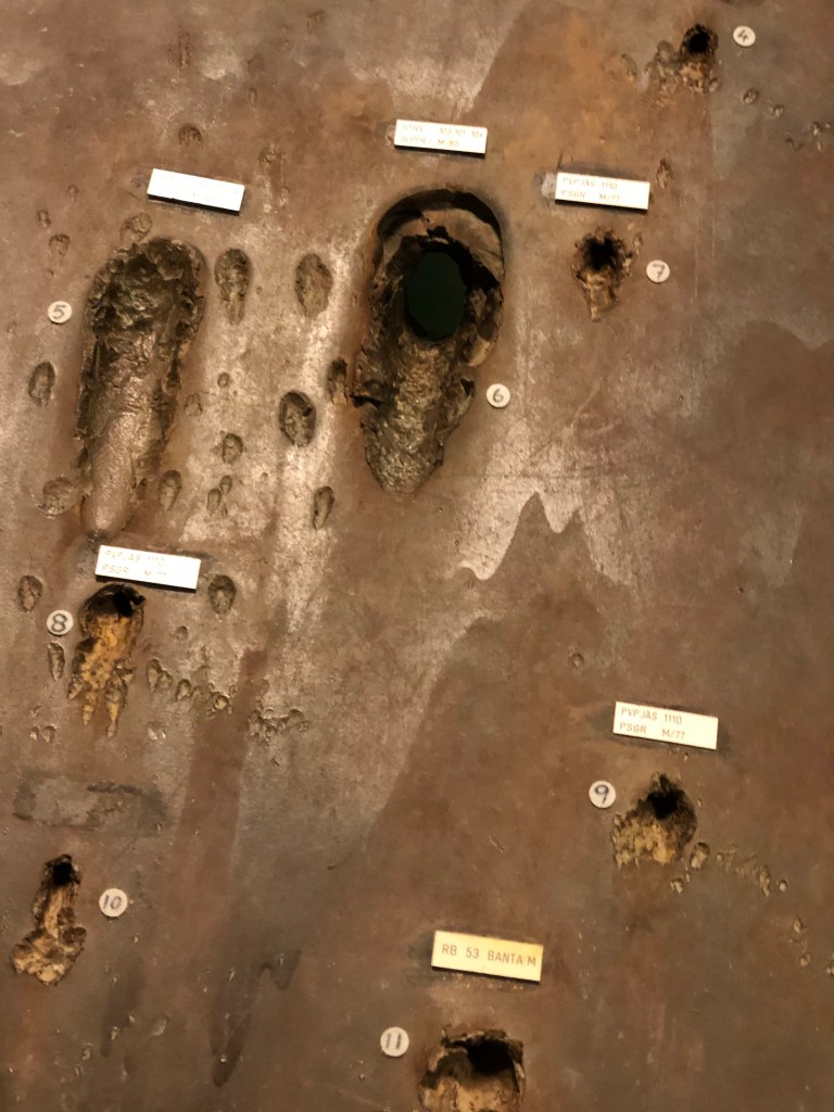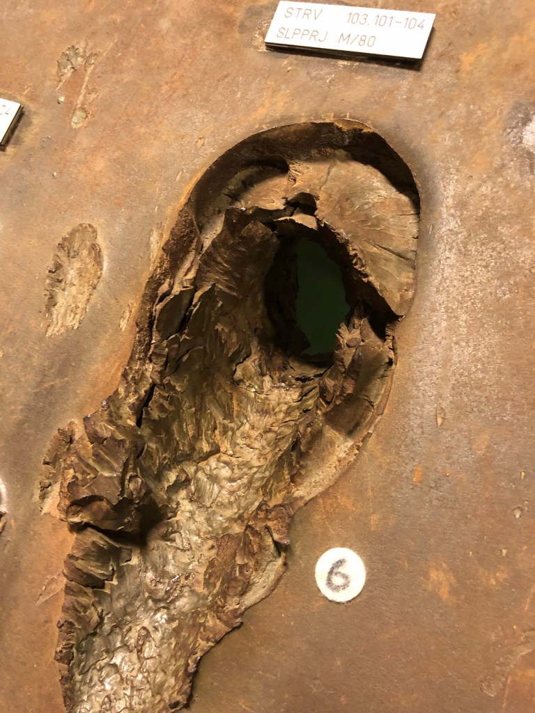 This hole (6) was made by the famous Swedish wedge tank, Stridsvagn 103.