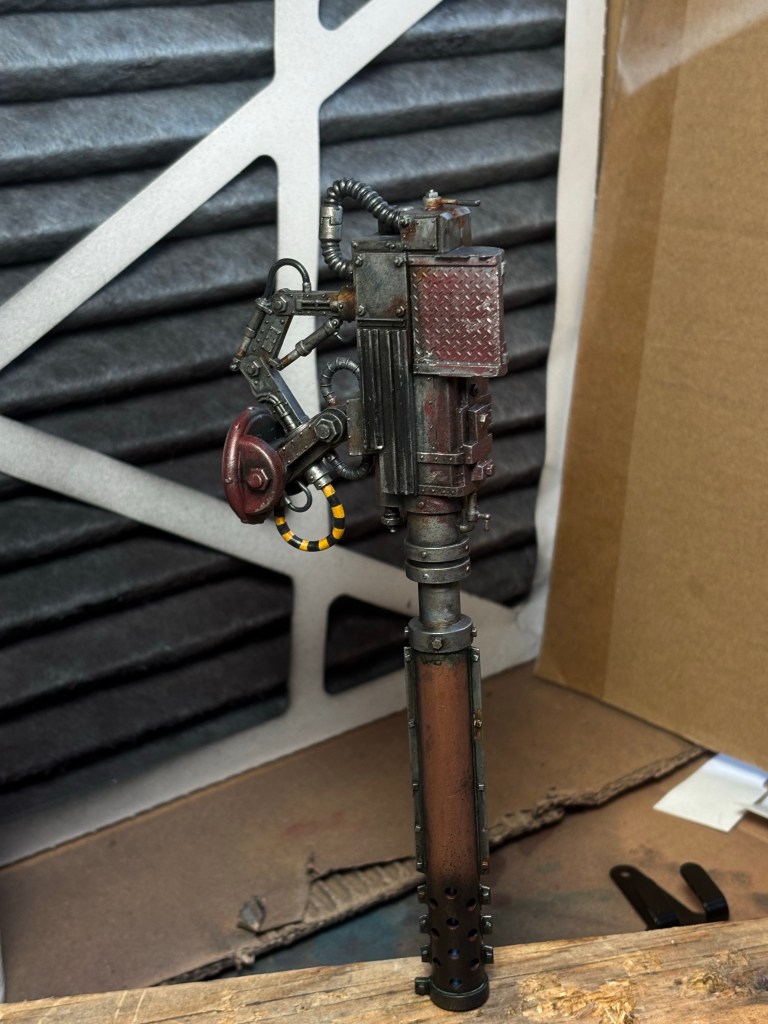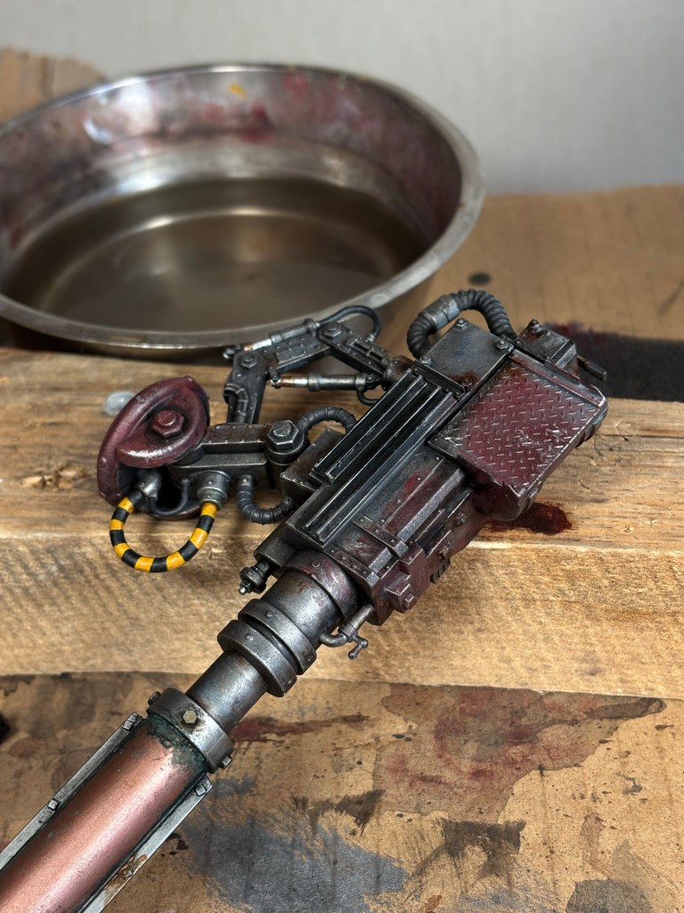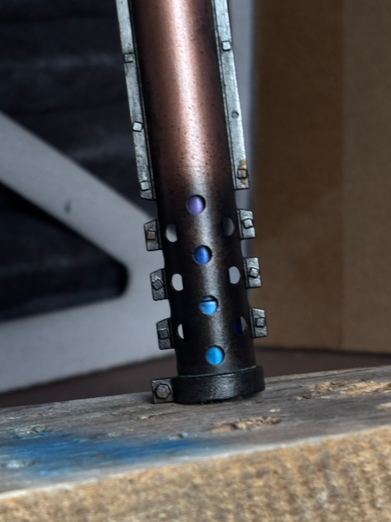 I feel like the warning stripes on that cable assist in making the whole thing look less rushed. The inner barrel is basepainted with citadel iron hands steel (or leadbelcher 🤷), followed by an airbrushing of Valljeo violet/blue transparent ink to give that heat discolouration effect.
