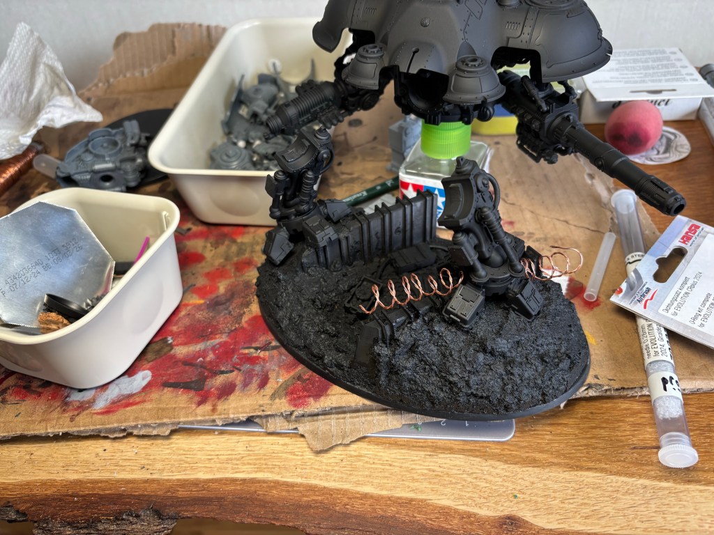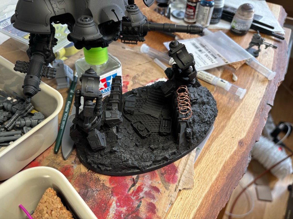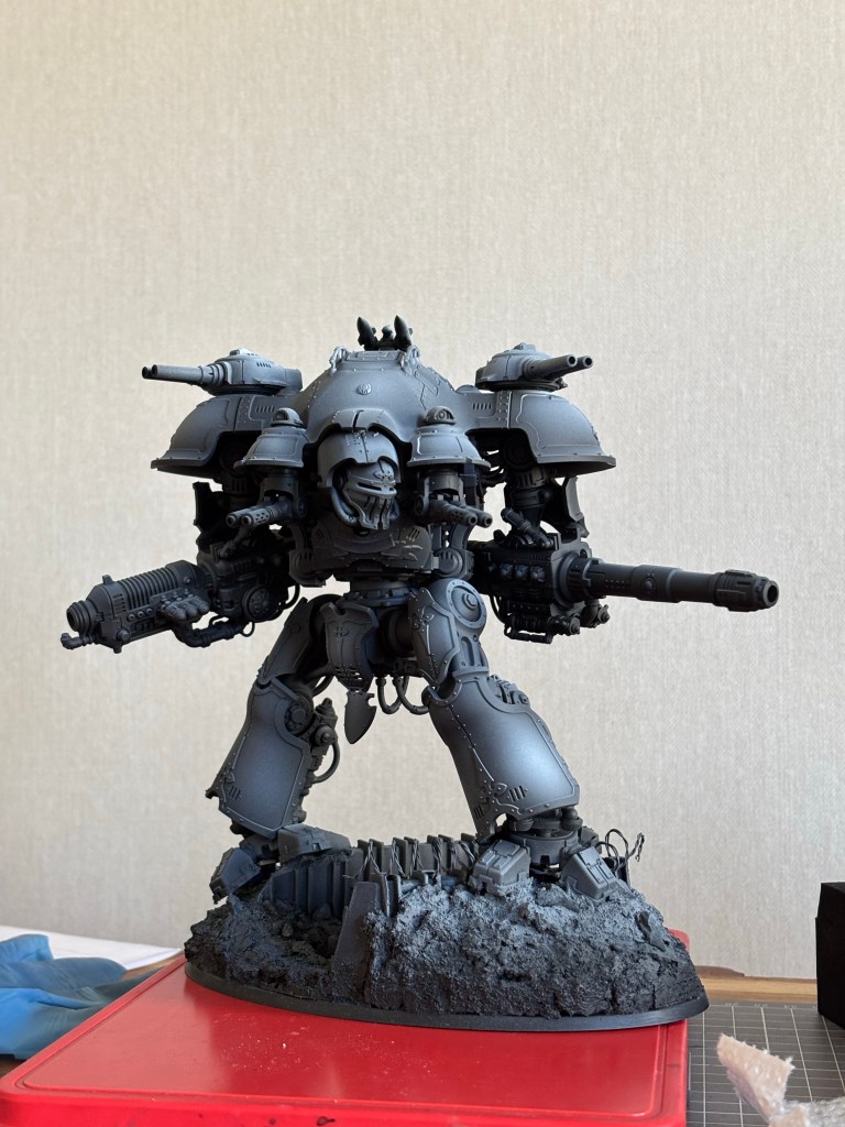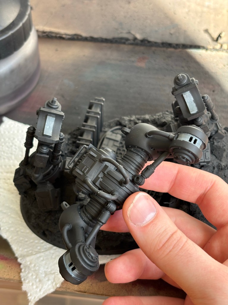 After some masking the primer goes on. I can finally get a proper feel for the texture on the base!